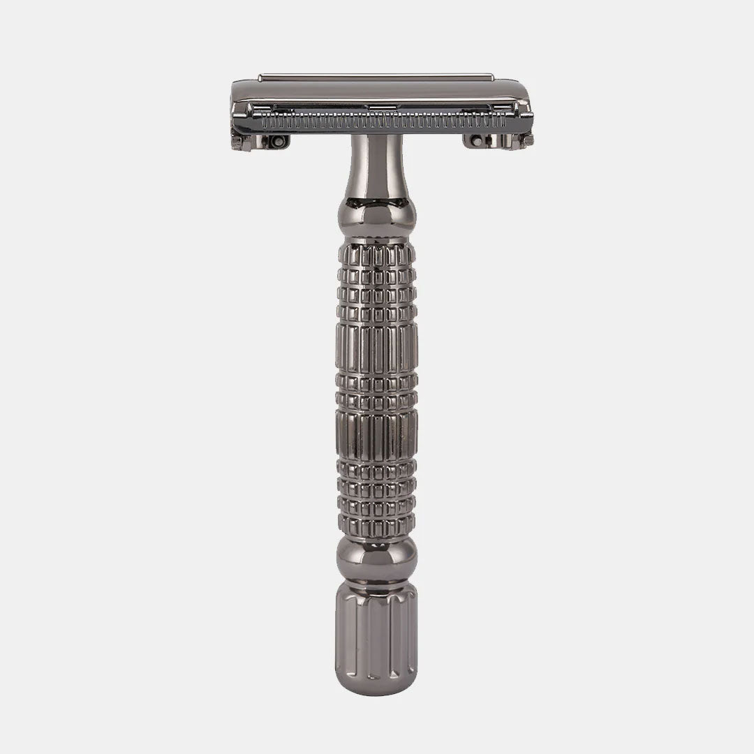 Loading the Blade: Unscrew the handle completely to separate the top cap, blade guard, and handle. Place a fresh double-edge blade onto the guard posts, align the top cap, and screw the handle back on until snug—do not overtighten.