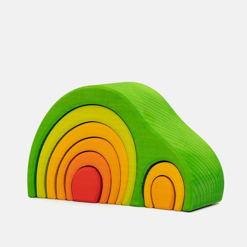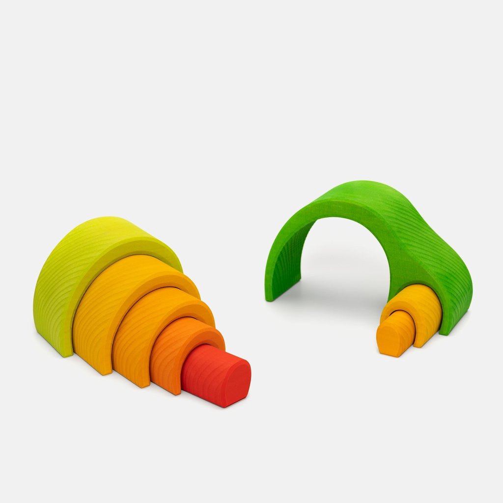 arch house by gluckskafer includes 8 pieces. approx dimensions: L 19 cm, W 7 cm, H 12 cm ages 2 - 99 gluckskafer blocks are coloured with water-based stains that bring out the characteristic of original wood. the surface feels slightly rougher to facilitate construction projects. about gluckskafer: as a...